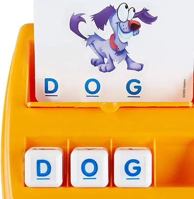 Point to the word below the picture, say the word, then spell the word out loud, letter by letter: "It's a dog... D-O-G".
