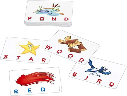 Players keep the cards when they answer correctly. Older players will cover the words so they must spell from memory.