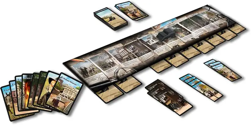 Shuffle these 10 cards together, then place one face down under each of the 10 Locations depicted on the board. You can slide them halfway under the board, or put them slightly overlapping their spots on the board, etc.