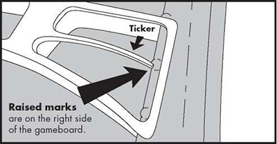 If the ticker passes over a raised mark, the offending player must discard the removed piece and any other pieces that have popped off of the board. The player must also discard ALL the pieces on their card and start over.