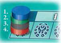 - 6 building tiles in the same color, placed dice-side up on the 6 corres- ponding spaces on his player board;