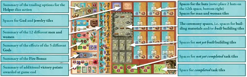 Building materials: Take one building material of your choice from the supply and place it onto a matching ceremony space on your player board. (Or take 2 or even 3 building materials. Note: they can be different types). Move hut: Move one of your huts onto the 12th space of your player board. (Or move 2 or even 3 of your huts).