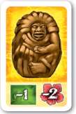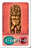 Example: Don uses his two woman tiles together to expand via a 4-value land path. He then uses a man tile that allows him to take one God card. He picks a Green God card that he immediately plays (after paying the requisite offering). He decides to activate another of his women tiles, and chooses one that lets him take one man tile from the game board.
