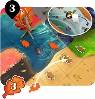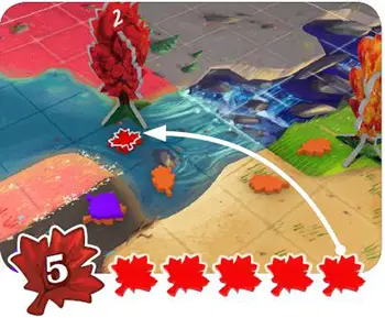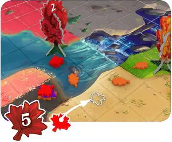 While most leaves fall on empty terrain, a player may cover another player's leaves in their path. Only the leaves on top will count toward scoring in winter.