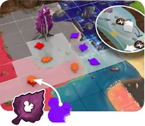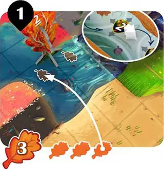 To cover a pile where their own leaf is on top, players play as if the terrain tile is empty (no additional cost). To cover another player's Leaf Token along their path, a player must: