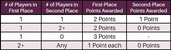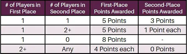 If a single player has the highest total value (first place), they are awarded 2 points. If a single player has the next-highest total value (second place), they are awarded 1 point.