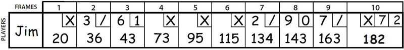 A strike counts as 10 plus the total of your next two rolls. (i.e. a strike in the first frame followed by rolls of five and three would score 18 in the first frame, the second frame would score eight for a total of 26 after two frames).
