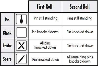 If an "X" is not rolled on the first roll, the player records the number of pins "downed" (blank dice). A "/" appearing on the first roll or an "X" appearing on the second roll are also counted as downed pins.