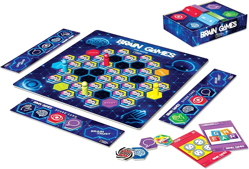 Pop out the 40 game tiles, and randomly place them face down - "Brain Games" side up - in the hexagon spaces on the game board. One tile per space. START spaces remain empty.
