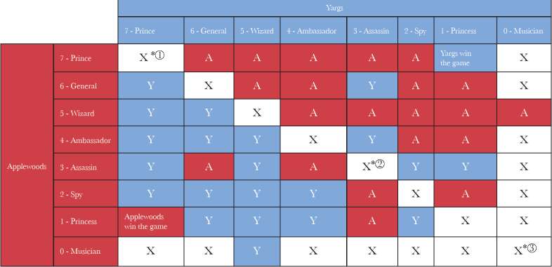 1The Player who played the general wins the round (9 vs 7).2The player who did not play the general wins the round (3 vs 5).3The round is nullified and put on hold.