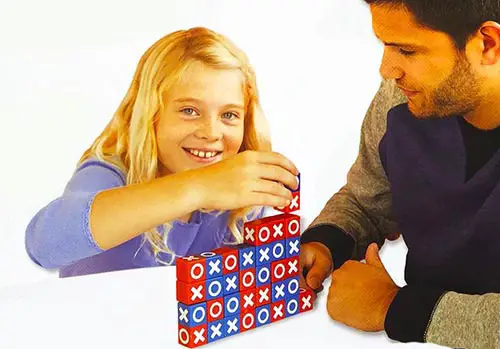 X's and O's are taken to a whole new dimension in this one of a kind strategy game. Players build a wall of bricks by placing their pieces on top of each other.