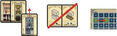 Supply: Place the Material card face up in front of you. Each card shows 2 Materials (steel, brick and/or wood). You need to own Material cards in order to perform the Construction action.