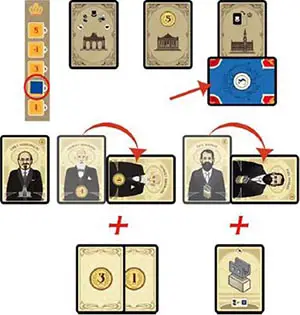 Example: John purchases the Emile Vandervelde card, which allows him to immediately retrieve one of his cards underneath the Prison card.