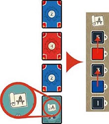 Example: Scott (blue) has placed 2 Architect cards of value 2 in the column with the Architecture bonus. Rob (red) played 1 card of value 4.
