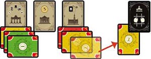 Example: John (yellow) has played a total of 3 Architect cards in the Brussels area. Claudia (green) played 2 and Rob (red)played 1. Therefore, John must place one of his 3 cards underneath the Prison card.