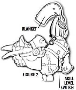 Attach Buckaroo's blanket by fitting the tab into the groove in his back. See Figure 2. Note: The blanket will not lie flat on Buckaroo's back.