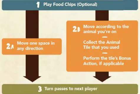 This player will start by "entering the jungle". To do so, they will place their pawn on any Animal Tile in the outer ring of the jungle. All other players will follow suit in clockwise turn order. Starting with the first player, players will take turns in order.