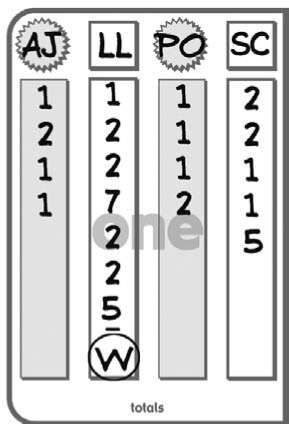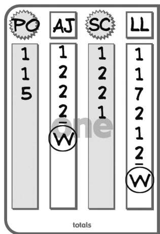 The current table's scorekeeper enters the initials of each player atop the scoring columns for the round to be played.