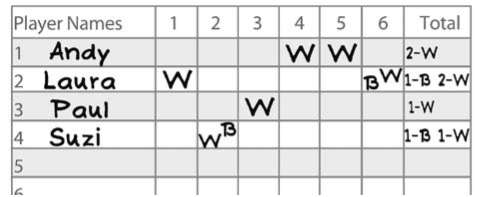 The scorekeeper at Table One enters, on the Master Score Sheet, the results for all players for the just- completed round. A "W" is entered for each member of the winning team at each table: there will be six "winners" in all.