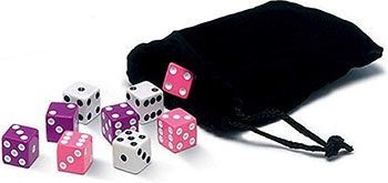 You'll find everything you need to play Bunco in this package-9 dice (3 of each color-red, white and blue), a two-sided score pad and a silver-toned game bell.
