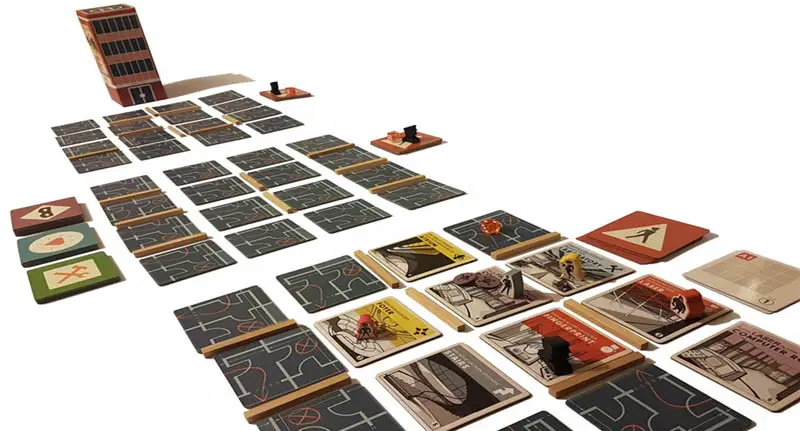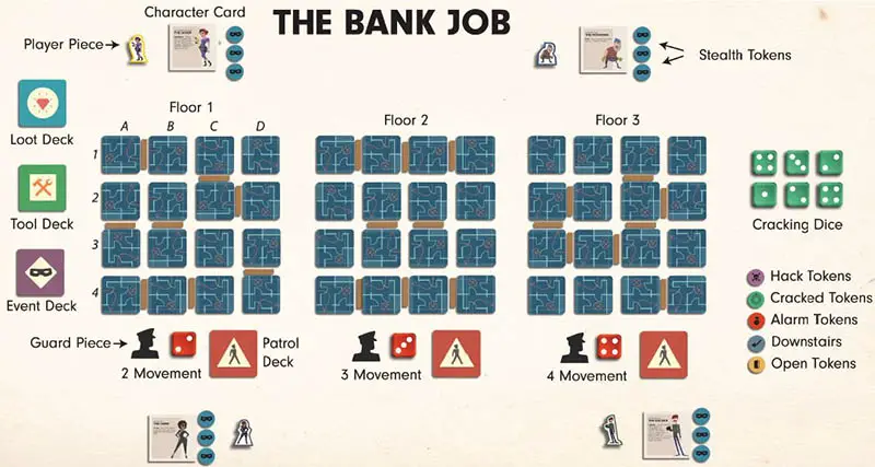 Place 1 Safe tile and 1 Stair tile into each of those decks, then shuffle and deal each deck face down into a 4x4 grid to represent a floor of the bank. Place 8 wall pieces between tiles on each floor, as indicated in the diagram "The Bank Job".