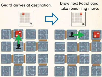 When the Guard reaches his destination, reveal the next Patrol card and place the the Guard die on the newly indicated location. If the Guard has not used up all of his movement, continue to move him toward this new destination.