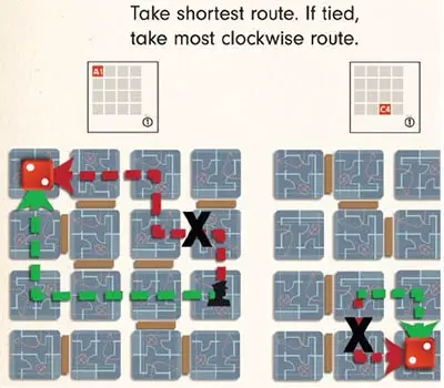 Remember, the Guard will always take the shortest possible path to the destination. If there are multiple shortest paths, the Guard will choose the path that follows the most clock- wise route (starting at left path from Guard's point of view).