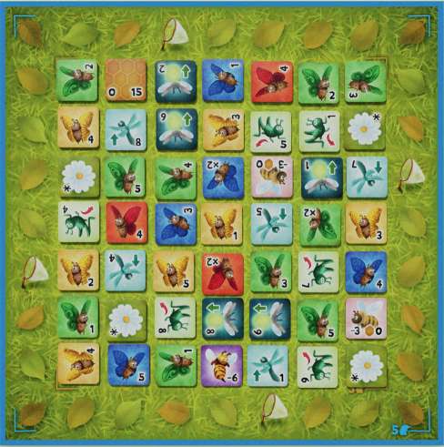 Using the chart shown at the lower left, randomly draw the correct number of tiles from the bag and place them face up on the board on marked spaces. When complete, the board should have the correct number of tiles for the numbers of players in the form of a square.