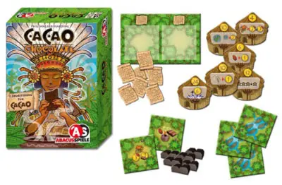 Cacao immerses the players in the exotic world of the "Fruit of the Gods". As the chief of your tribe, you must lead your people to prosperity and glory through the cultivation and trade of cacao. At the end of the game, the player with the most gold wins.