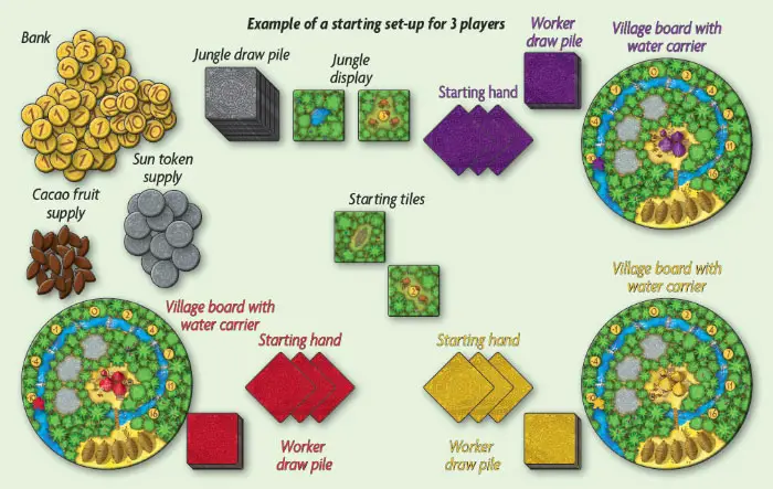 Draw 2 Jungle tiles from the Jungle draw pile and place them next to the pile as a faceup Jungle display. Sort the gold coins, cacao fruits and sun tokens into separate supplies.