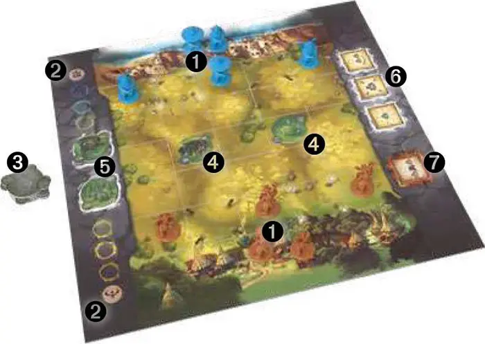 Each player chooses a tribe and takes the corresponding 5 shamans and Victory token.