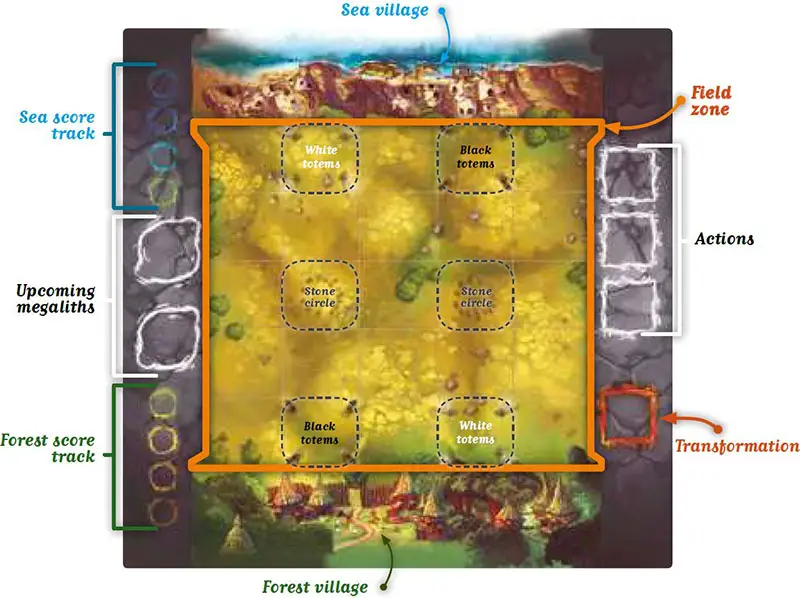 Place the gameboard in the middle of the table, such that the sea is in front of the sea player and the forest is in front of the forest player.