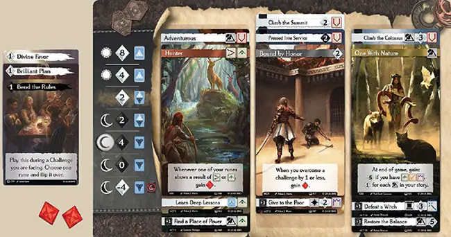 After a Hero or Antihero card takes effect, place it face-up beside your character tableau. At end of game, add the Triumph or Tragedy value of any played cards to your score.