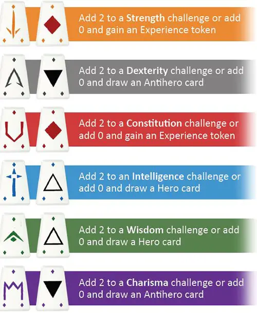 On your turn, you may gain a Trait or face a Challenge. You may also take other actions (see page 6), such as spending experience tokens and playing Hero or Antihero cards.