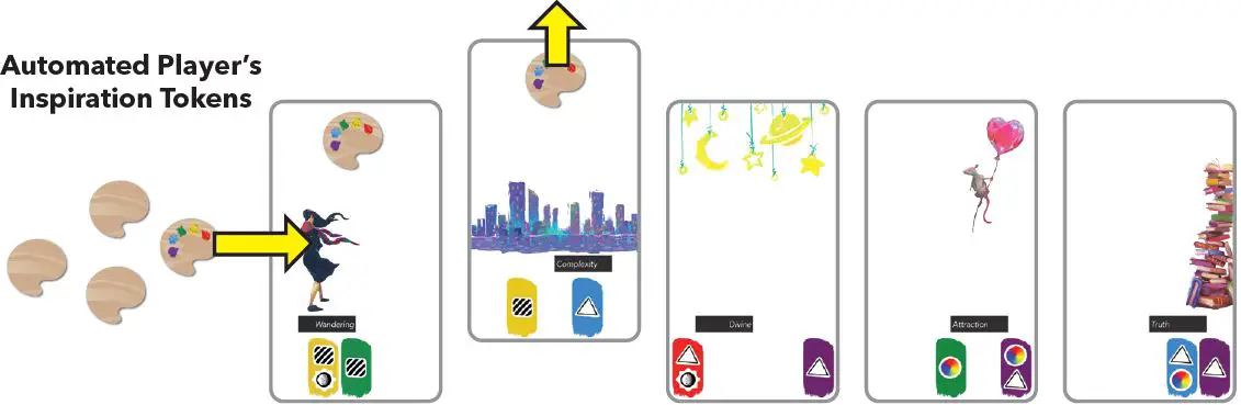 The face-up token is placed on the first Art Card and the automated player takes the second card along with the Inspiration token on it.