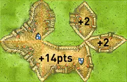 A player who owns a knight in a completed city scores 2 points per tile used in the city. Each shield or banner in the city gives the player 2 bonus points.