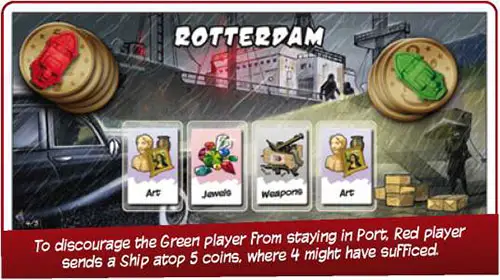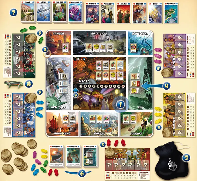 Players acquire Victory cards throughout the game by sending their Cargo ships to the most lucrative destinations; successfully smuggling Cargo tokens out of Ports and into their Warehouses; and unloading this cargo at the right time to acquire the most valuable Victory cards.