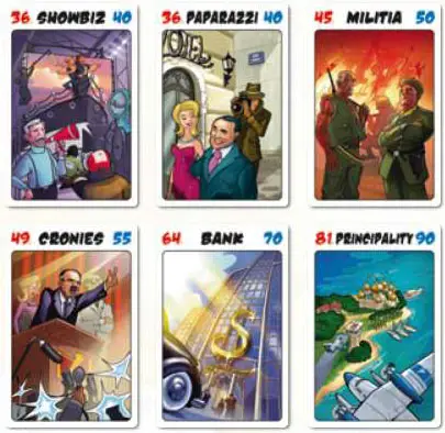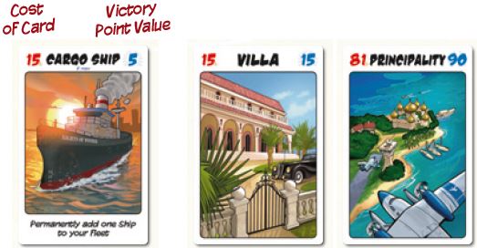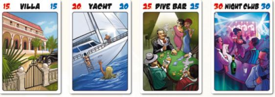 Four types of cards, the Villa, Yacht, Dive Bar and Night Club are worth as many Victory points as they cost to acquire. There are 6 copies of each, and a player may acquire as many as he can afford.