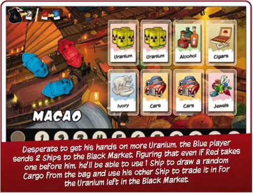 For each of his Ships there, the player may either draw 1 Cargo token at random from the bag to add to his own; OR swap one Cargo already in his possession with one he wants from those in the Black Market, in Phase 1 of his next turn.
