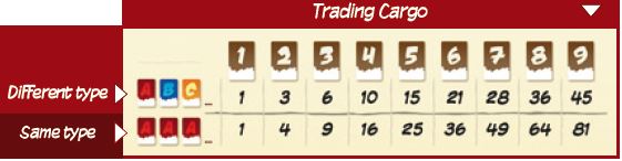 The more Cargo in a combination, the more contraband value this combination is worth (up to the limit of 9 Cargo tokens per combination). Combinations that are all the same type are more valuable - and harder to acquire.