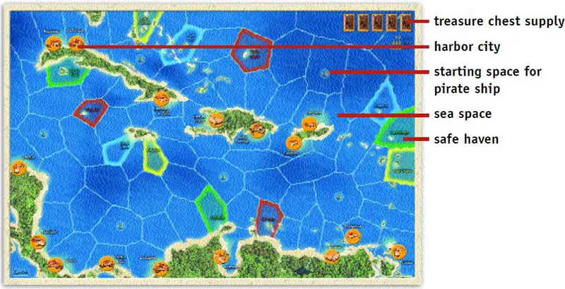 Shuffle the 16 treasure chests face down. Choose 6 treasure chests at random and place them face-up on the ports indicated on them.