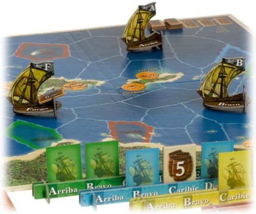 First, each player reveals his bidding card for Arriba by placing it face up in front of his cardholder so all can see it. The player who bid the most barrels, immediately moves the Arriba, moving it a number of sea spaces equal to the number of barrels in his bid.