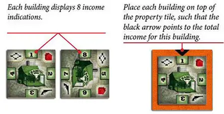 Example: If a player owns a drugstore with a neighboring ranch of his and three neighboring houses, he gets $15 (actually, the ranch is counted twice, the first time as a neighboring house, and the second time as a ranch).