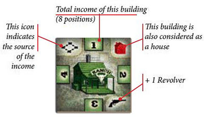 During the game, you can take various actions that earn you victory points for your plots, pistols (the hired help), and buildings.