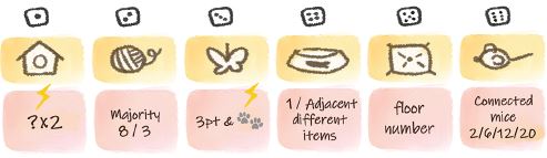 After marking a house on the sheet, choose a Cat that has not yet been scored. Immediately score 2 points for each of the items on your sheet that are shown with the Cat. Write down the number of points below that cat.