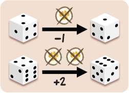 Example: Kuly kept a die of value 2 and the central die shows a value of 4. Using 3 footprints, Kuly changes her 2 value die to a value of I (-1), and her 4 value die to a value of 6 (+2)