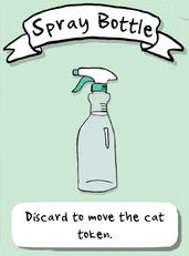 When you take a spray bottle card, keep it in your hand until you choose to play it during one of your turns. Playing a spray bottle allows you to move the cat token.
