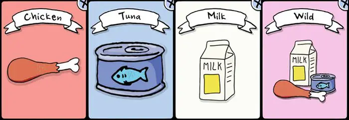 There are also x2 chicken, x2 tuna, and x2 milk cards. When you take one of these cards, you collect 2 food cubes of that color.