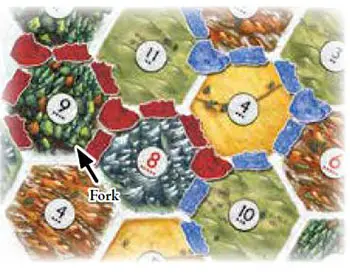 Longest Road Example: Red has a continuous connection of 6 roads (not counting the fork); therefore she has the "Longest Road". Blue's 7-road linkage is interrupted by one of Red's settlements. So, Blue's longest road is 5.