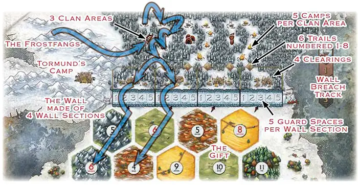 The Gift is bounded by the Starks' kingdom to the south and the seas to the east and west. To the north stands the Wall-the towering dam holding back the wildlings and the other horrors of the northern wastes. You must settle and expand your holding in the Gift. After all, starving and poorly armed men make poor guards.